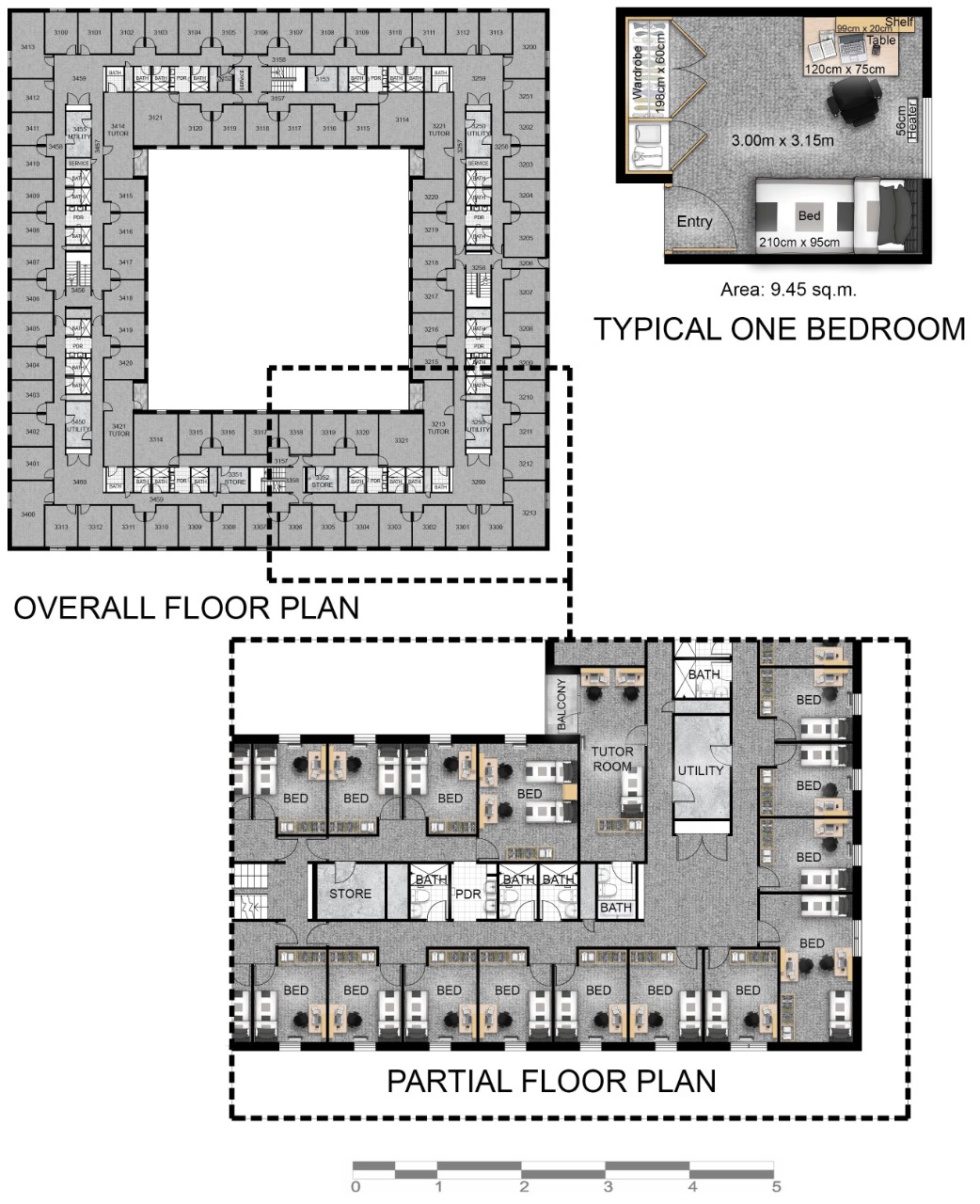 A typical one bedroom in University Hall is 3.0m x 3.5m (9.45 sq.m).